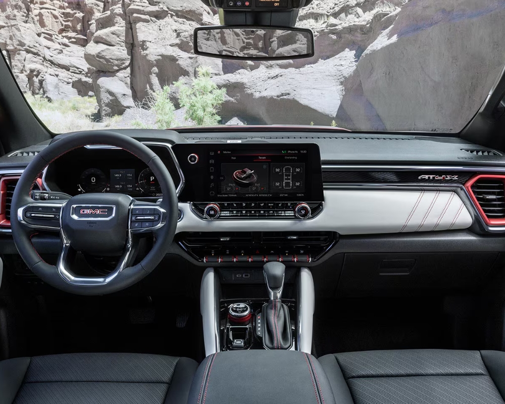 Inside, the Canyon balances rugged utility with smart comfort. The materials vary by trim, but all versions feel solid and practical. Denali offers premium finishes like leather seats and wood accents. The layout is clean and driver-focused, and there’s plenty of small-item storage throughout the cabin.